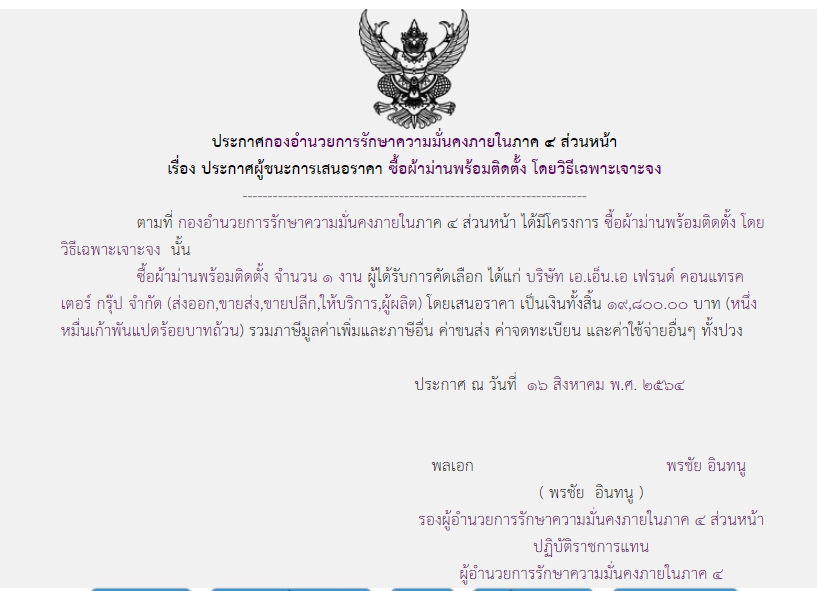 จัดซื้อ จัดจ้างประกาศผู้ชนะการเสนอราคา ประกาศผู้ชนะการเสนอราคา ซื้อผ้าม่านพร้อมติดตั้ง โดยวิธีเฉพาะเจาะจง ( ๑๙,๘๐๐.๐๐ บาท ) August 19, 2021 592 Share Facebook Twitter Google+ Telegram LINE กอ.รมน.ภาค ๔ สน.