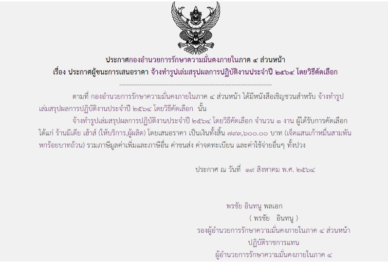 จัดซื้อ จัดจ้างประกาศผู้ชนะการเสนอราคา ประกาศผู้ชนะการเสนอราคา จ้างจัดทำรูปเล่มสรุปผลการปฏิบัติงาน ประจำปี ๒๕๖๔ โดยวิธีคัดเลือก ( ๗๙๓,๖๐๐.๐๐ บาท ) August 19, 2021 554 Share Facebook Twitter Google+ Telegram LINE กอ.รมน.ภาค ๔ สน.