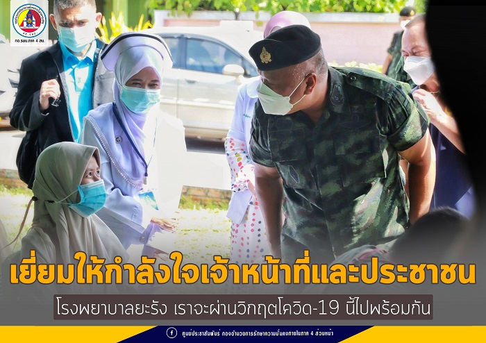 โดยแม่ทัพภาคที่ 4 ได้พูดคุยให้กำลังใจกับบุคลากรทางการแพทย์ เจ้าหน้าที่โรงพยาบาลยะรัง และประชาชนที่เข้ารับบริการฉีดวัคซีนว่า “สถานการณ์การแพร่ระบาดของเชื้อไวรัสโควิด-19 มีแนวโน้มสูงขึ้นอย่างต่อเนื่อง ที่ผ่านมาจะเห็นได้ว่าบุคลากรทางการแพทย์ และเจ้าหน้าที่ทุกคน ทุ่มเทแรงกาย แรงใจ เพื่อดูแลพี่น้องประชาชนอย่างเต็มกำลังความสามารถ ในวันนี้ได้มีโอกาสมาเยี่ยมเยียนให้กำลังใจการทำงาน รวมไปถึงห่วงใยทั้งปัญหาสุขภาพทั้งร่างกาย และจิตใจของทุกฝ่าย และถือโอกาสนำของมามอบให้ในครั้งนี้ เพราะรู้ว่าทุกคนมีความเสี่ยงในการปฏิบัติงาน ต้องดูแลตนเอง รวมไปถึงป้องกันไม่ให้ส่งผลกระทบกับคนในครอบครัวหากเจ้าหน้าที่ขาดเหลือสิ่งใดสามารถประสานหน่วยทหารในพื้นที่ได้ตลอด กองทัพบกมีการเตรียมความพร้อม เพื่อช่วยเหลือ สนับสนุนอย่างเต็มกำลัง ทั้งนี้เจ้าหน้าที่ทางการแพทย์ และกองทัพบกปฏิบัติงานเพื่อดูแลพี่น้องประชาชนอย่างเต็มกำลัง สิ่งสำคัญคือพี่น้องประชาชนทุกคนต้องช่วยกันดูแล เฝ้าระวัง ป้องกัน และปฏิบัติตนตามมาตรการป้องกันการแพร่ระบาดของเชื้อไวรัสโควิด-19 ที่กระทรวงสาธารณสุขและจังหวัดกำหนด เชื่อว่าหากเราร่วมแรง ร่วมใจ และเป็นกำลังใจให้กันอยู่เสมอ เราจะสามารถผ่านวิกฤตครั้งนี้ไปพร้อมกัน”