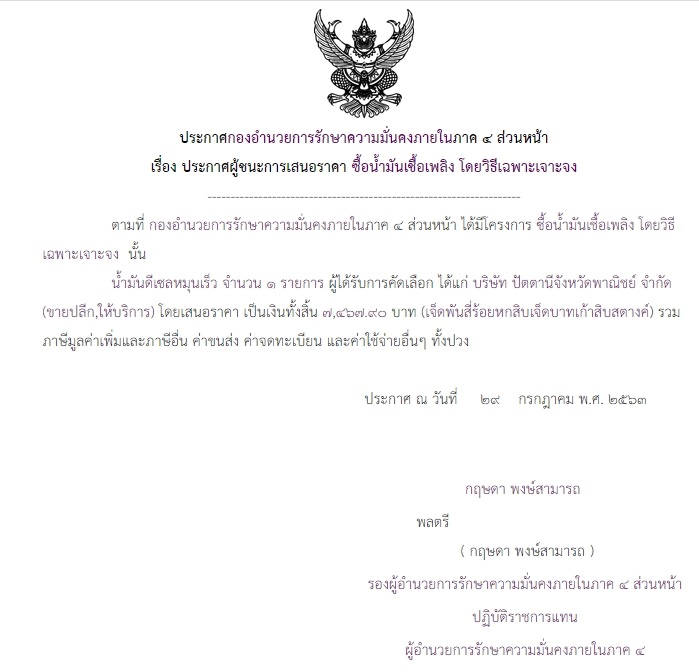 ประกาศผู้ชนะการเสนอราคา ซื้อน้ำมันเชื้อเพลิง โดยวิธีเฉพาะเจาะจง (7,467.90)