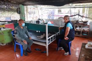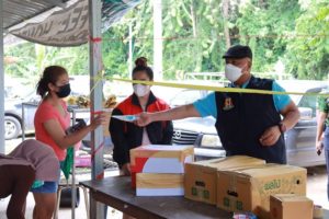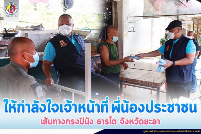 โดยตลอดเส้นทางของการตรวจเยี่ยมกำลังเจ้าหน้าที่ต่าง ๆ ในอำเภอกรงปินัง และอำเภอธารโตครั้งนี้ แม่ทัพภาคที่ 4 ยังได้แวะพบปะ เยี่ยมเยียน ให้กำลังใจพี่น้องประชาชน กลุ่มร้านค้า และกลุ่มแม่บ้านเกษตรกรคอกช้าง อำเภอธารโต สอบถามสภาพความเป็นอยู่ ปัญหาและผลกระทบที่เกิดขึ้นจากสถานการณ์การแพร่ระบาดของเชื้อไวรัส covid-19 โดยกล่าวว่า ” สถานการณ์การแพร่ระบาดของเชื้อไวรัส covid-19 ที่เกิดขึ้นในขณะนี้ รู้ว่าทุกคนต้องเผชิญกับปัญหา และความยากลำบากไม่น้อย ทั้งปัญหาในการดำรงชีวิต และปัญหาด้านเศรษฐกิจ พ่อค้าแม่ค้า ผู้ประกอบการมีความยากลำบากต่อการค้าขายมากขึ้น เป็นห่วงพี่น้องประชาชนจึงได้แวะเวียนมาให้กำลังใจ อยากให้ทุกคนได้ผ่านวิกฤต covid-19 ไปพร้อมกัน ซึ่งไม่ว่าวิกฤตจะหนักหนาเพียงใด หากเราทุกคนร่วมด้วยช่วยกัน เชื่อได้ว่าเราจะผ่านมันไปได้ อยากให้ทุกคนได้ปฏิบัติตามมาตรการป้องกันการแพร่ระบาดของเชื้อไวรัส covid-19 อย่างเคร่งครัด ช่วยกันประชาสัมพันธ์สร้างความเข้าใจถึงความจำเป็นต่อการป้องกันการแพร่ระบาด ตลอดจนเชิญชวนให้พี่น้องประชาชนได้เข้ารับบริการฉีดวัคซีนป้องกันเชื้อcovid -19 เพื่อสร้างภูมิคุ้มกันหมู่” ก่อนแม่ทัพภาคที่ 4 จะได้มอบเจลแอลกอฮอล์ล้างมือ หน้ากากอนามัยให้กลุ่มพี่น้องประชาชน เพื่อเป็นการป้องกันการแพร่ระบาดของเชื้อไวรัส covid-19 และอุดหนุนสินค้าจากชุมชน เพื่อเป็นการช่วยเหลือชาวบ้านอีกทางหนึ่งด้วย