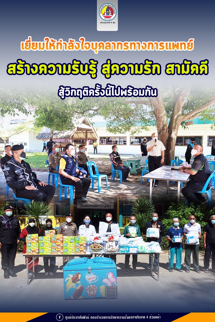นอกจากนี้ แม่ทัพภาคที่ 4 ยังได้พูดคุย ให้กำลังใจกับพี่น้องประชาชนที่เข้ารับการรักษาว่า “ขอให้ทุกคนได้มีกำลังใจในการสู้กับโรคร้ายครั้งนี้ ขอให้ทุกคนได้เชื่อมั่น มั่นใจในการทำงานบุคลากรทางการแพทย์ และเจ้าหน้าที่ทุกคน จะเห็นได้ว่าวันนี้ทุกคนตั้งใจในการทำหน้าที่ดูแลผู้ป่วยอย่างดีที่สุด หลังจากนี้สิ่งที่เราจะทำได้นั่นก็คือ การช่วยกันประชาสัมพันธ์ สร้างความตระหนักรู้ถึงการปฏิบัติตนตามมาตรการป้องกัน covid-19 ให้กับประชาชนคนอื่นๆได้ปฏิบัติตาม เป็นตัวอย่างที่ดีให้กับผู้อื่น ทั้งการสวมหน้ากากอนามัยตลอดเวลาในที่สาธารณะ การหมั่นล้างมือทำความสะอาด และการเว้นระยะห่างอย่างเหมาะสม เป็นกำลังใจให้ผู้ป่วยทุกคนรักษาหายกลับบ้าน และสามารถใช้ชีวิตได้อย่างปกติสุขต่อไป เราจะผ่านวิกฤตครั้งนี้ไปพร้อมกัน “