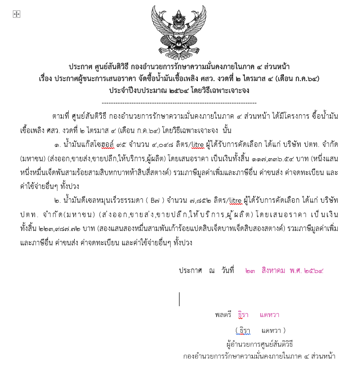 ประกาศผู้ชนะการเสนอราคา จัดซื้อน้ำมันเชื้อเพลิง ศสว. งวดที่ ๒ ไตรมาส ๔ ( เดือน ก.ค.๖๔ ) ประจำปีงบประมาณ ๒๕๖๔ โดยวิธีเฉพาะเจาะจง ( ๑๑๗,๓๓๖.๕๔ บาท )