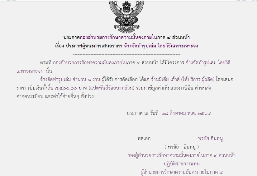 ประกาศผู้ชนะการเสนอราคา จ้างจัดทำรูปเล่ม โดยวิธีเฉพาะเจาะจง ( ๘,๔๐๐.๐๐ บาท )