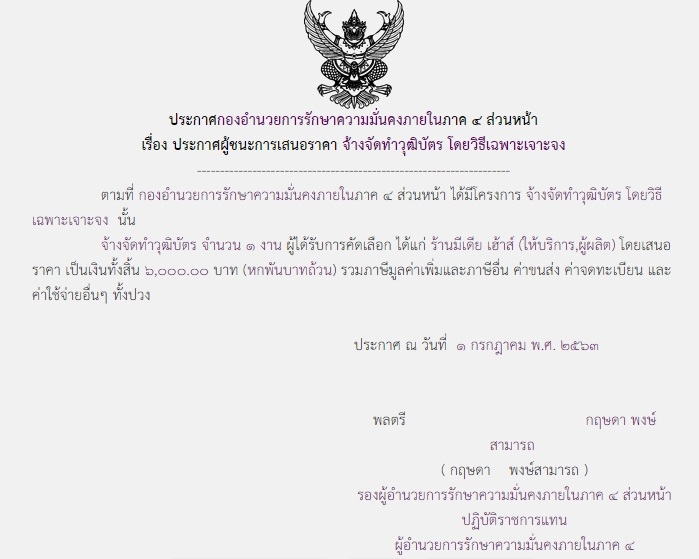 จัดซื้อ จัดจ้างประกาศผู้ชนะการเสนอราคา ประกาศผู้ชนะการเสนอราคา จ้างจัดทำวุฒิบัตร โดยวิธีเฉพาะเจาะจง (6,000.00) August 5, 2020 1715 Share Facebook Twitter Google+ Telegram LINE สบป.กอ.รมน.ภาค 4 สน.