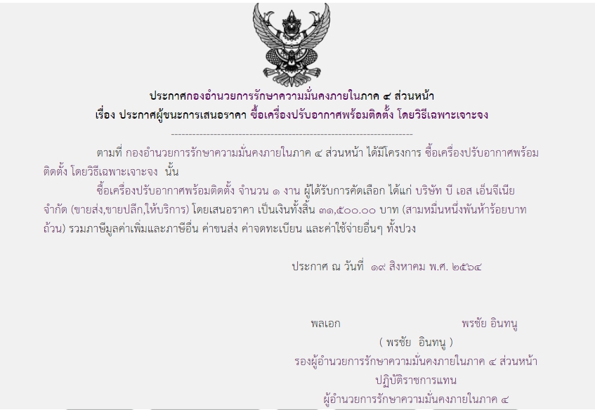 ประกาศผู้ชนะการเสนอราคา ซื้อเครื่องปรับอากาศพร้อมติดตั้ง โดยวิธีเฉพาะเจาะจง ( ๓๑,๕๐๐.๐๐ บาท )