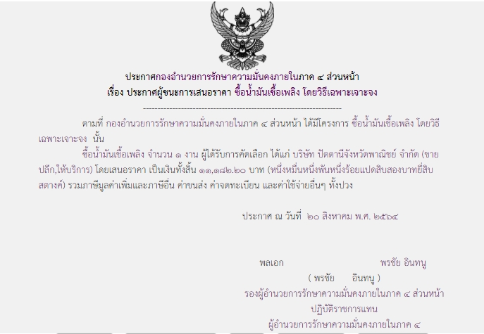 ประกาศผู้ชนะการเสนอราคา ซื้อน้ำมันเชื้อเพลิง โดยวิธีเฉพาะเจาะจง ( ๑๑,๑๘๒.๒๐ บาท )