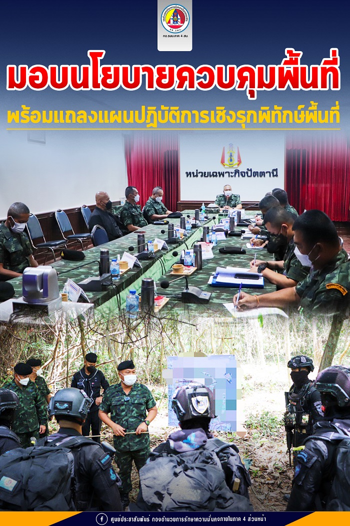 วันนี้ ( 27 สิงหาคม 2564 ) เวลา 09.00 น. ที่ ห้องประชุม หน่วยเฉพาะกิจปัตตานี ตำบลบ่อทอง อำเภอหนองจิก จังหวัดปัตตานี พลโท เกรียงไกร ศรีรักษ์ แม่ทัพภาคที่ 4/ผู้อำนวยการรักษาความมั่นคงภายในภาค 4 ลงพื้นที่ตรวจเยี่ยม ติดตามผลการปฏิบัติงานที่สำคัญในห้วงที่ผ่านมา ตลอดจนรับฟังบรรยายสรุปการปฏิบัติแผนเชิงรุกพิทักษ์พื้นที่ ของหน่วยเฉพาะกิจในพื้นที่จังหวัดปัตตานี ก่อนมอบนโยบายแนวทางการวางแผนปรับโครงสร้าง และการสับเปลี่ยนกำลังพลของหน่วย เน้นย้ำกำลังพลช่วงรอยต่อของการสับเปลี่ยนกำลังให้หน่วยได้วางแผนจัดกำลังในการปฏิบัติงานอย่างรอบคอบ เพิ่มความระมัดระวังในการปฏิบัติงานเป็นพิเศษ คำนึงถึงความปลอดภัยเป็นสำคัญ เพื่อป้องกันและลดการก่อเหตุที่อาจจะเกิดขึ้น สร้างความเชื่อมั่นแก่พี่น้องประชาชน โดยมี พลตรี ธิรา แดหวา รองผู้อำนวยการรักษาความมั่นคงภายในภาค 4 ส่วนหน้า พร้อมด้วย พลตรี คมกฤช รัตนฉายา ผู้บังคับหน่วยเฉพาะกิจปัตตานี ผู้บังคับหน่วยเฉพาะกิจกรมทหารพรานในพื้นที่ และส่วนที่เกี่ยวข้องเข้าร่วมประชุม