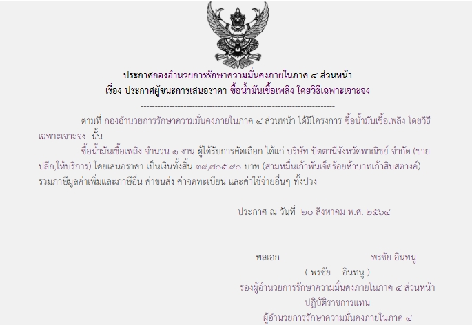 ประกาศผู้ชนะการเสนอราคา ซื้อน้ำมันเชื้อเพลิง โดยวิธีเฉพาะเจาะจง ( ๓๙,๗๐๕.๙๐ บาท )