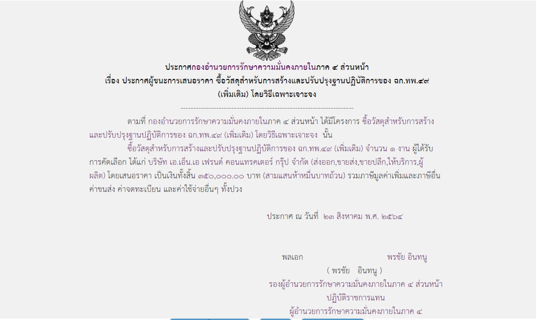 จัดซื้อ จัดจ้างประกาศผู้ชนะการเสนอราคา ประกาศผู้ชนะการเสนอราคา ซื้อวัสดุสำหรับการสร้างและปรับปรุงฐานปฏิบัติการของ ฉก.ทพ.๔๙ ( เพิ่มเติม ) โดยวิธีเฉพาะเจาะจง ( ๓๕๐,๐๐๐.๐๐ บาท ) August 27, 2021 539 Share Facebook Twitter Google+ Telegram LINE กอ.รมน.ภาค ๔ สน.