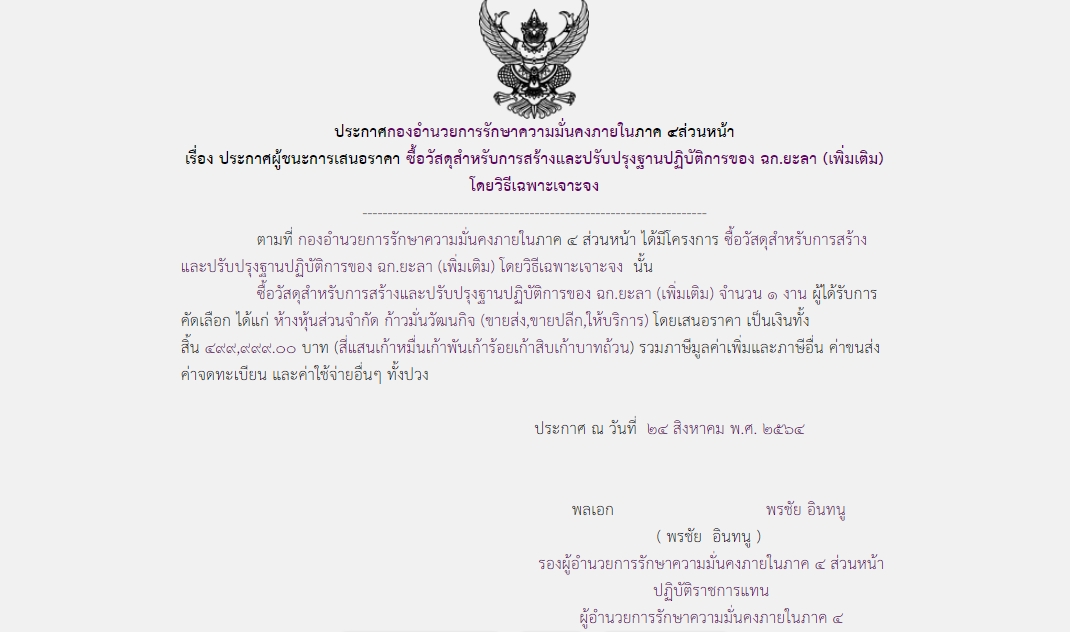 ประกาศผู้ชนะการเสนอราคา ซื้อวัสดุสำหรับการสร้างและปรับปรุงฐานปฏิบัติการของ ฉก.ยะลา ( เพิ่มเติม ) โดยวิธีเฉพาะเจาะจง ( ๔๙๙,๙๙๙.๐๐ บาท )