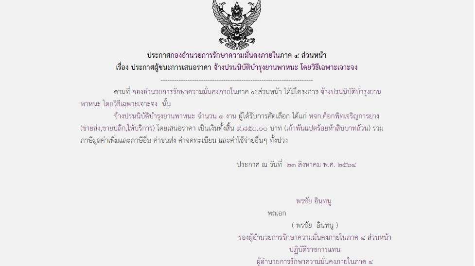 ประกาศผู้ชนะการเสนอราคา จ้างปรนนิบัติบำรุงยานพาหนะ โดยวิธีเฉพาะเจาะจง ( ๙,๘๕๐.๐๐ บาท )