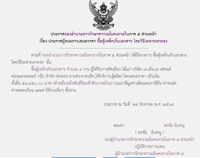 ประกาศผู้ชนะการเสนอราคา ซื้อตู้เหล็กเก็บเอกสาร โดยวิธีเฉพาะเจาะจง ( ๕๑,๔๕๐.๐๐ บาท )