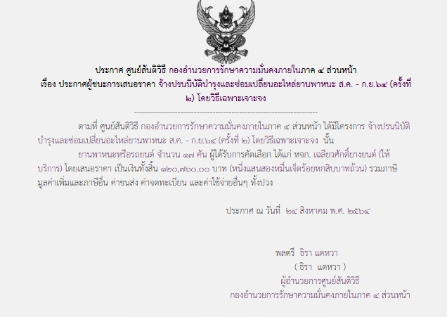 จัดซื้อ จัดจ้างประกาศผู้ชนะการเสนอราคา ประกาศผู้ชนะการเสนอราคา จ้างปรนนิบัติบำรุงและซ่อมเปลี่ยนอะไหล่ยานพาหนะ ส.ค. – ก.ย.๖๔ ( ครั้งที่ ๒ ) โดยวิธีเฉพาะเจาะจง ( ๑๒๐,๗๖๐.๐๐ บาท ) August 28, 2021 648 Share Facebook Twitter Google+ Telegram LINE ศูนย์สันติวิธี