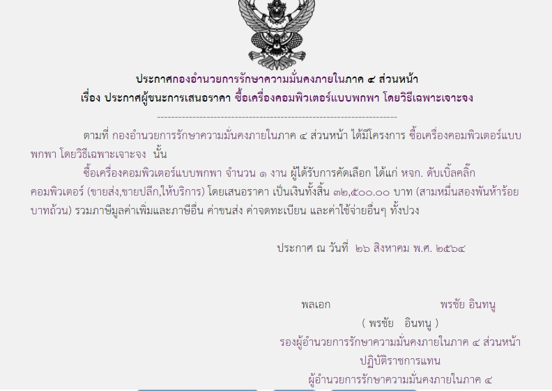 ประกาศผู้ชนะการเสนอราคา ซื้อเครื่องคอมพิวเตอร์แบบพกพา โดยวิธีเฉพาะเจาะจง ( ๓๒,๕๐๐.๐๐ บาท )