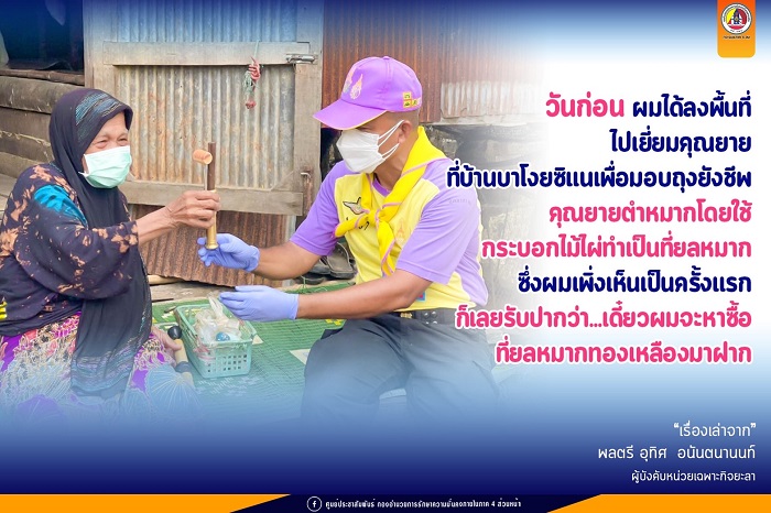 วันก่อนผมได้ลงพื้นที่ไปเยี่ยมคุณยายในพื้นที่บ้านบาโงยซิแน อำเภอยะหา จังหวัดยะลา เพื่อมอบถุงยังชีพ เมื่อก่อนคุณยายเป็นหมอตำแย (ทำคลอด) ท่านตำหมากโดยใช้กระบอกไม้ไผ่ทำเป็นที่ยลหมาก ซึ่งผมพึ่งเห็นเป็นครั้งแรกเหมือนกัน ที่ผ่านมาเคยเห็นที่ยลหมากเป็นเเบบเงินหรือทองเหลือง ก็เลยรับปากว่า เดี๋ยวผมจะหาซื้อที่ยลหมากทองเหลืองมาฝาก