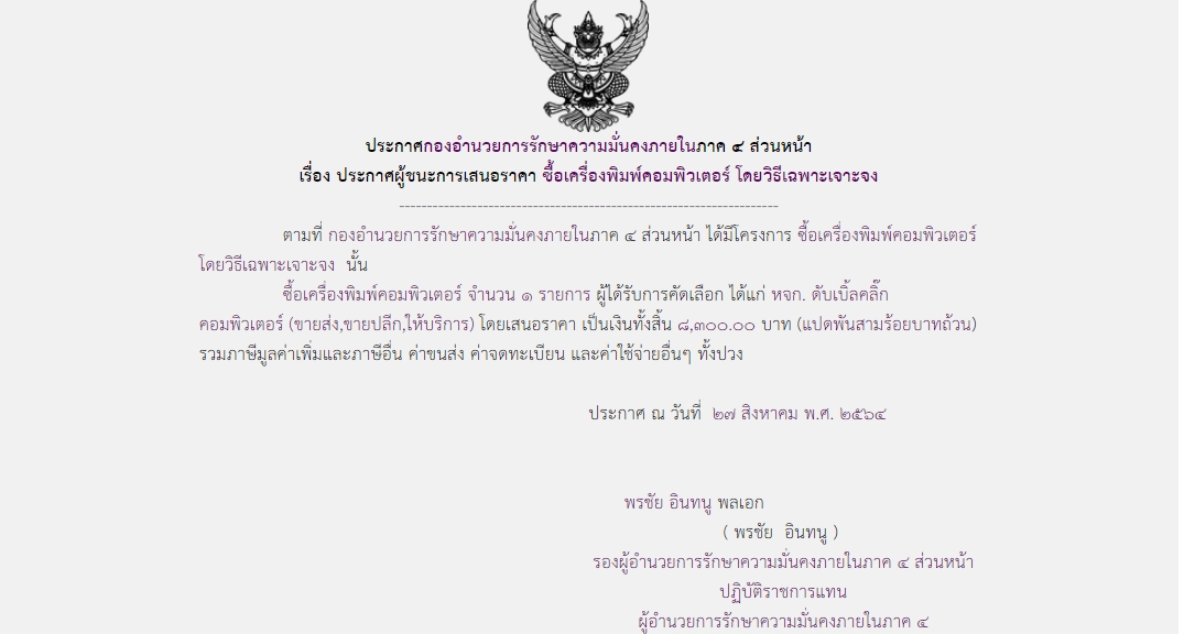 ประกาศผู้ขนะการเสนอราคา ซื้อเครื่องพิมพ์คอมพิวเตอร์ โดยวิธีเฉพาะเจาะจง ( ๘,๓๐๐.๐๐ บาท )