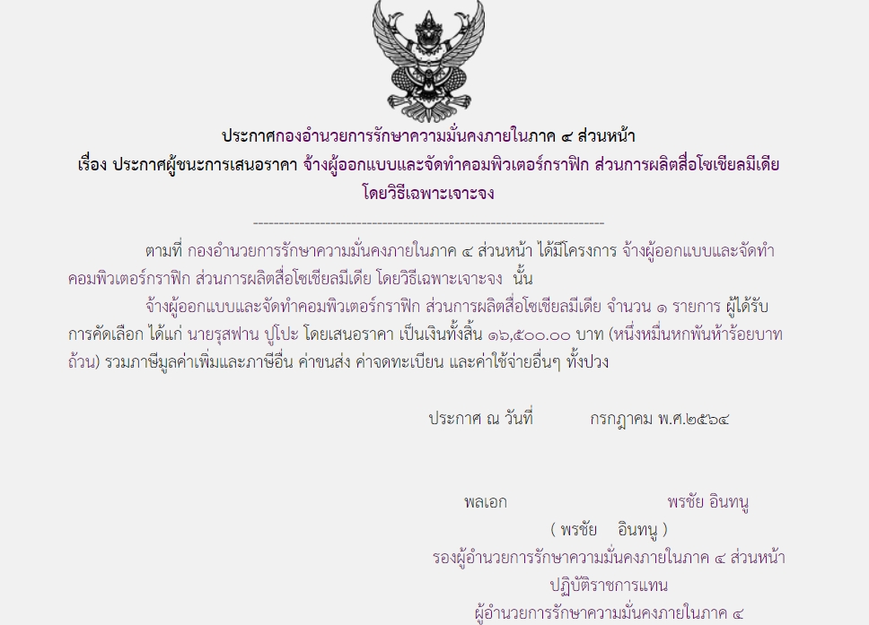 ประกาศผู้ชนะการเสนอราคา จ้างผู้ออกแบบและจัดทำคอมพิวเตอร์กราฟิก ส่วนการผลิตสื่อโซเขียลมีเดีย โดยวิธีเฉพาะเจาะจง ( ๑๖,๕๐๐.๐๐ บาท )