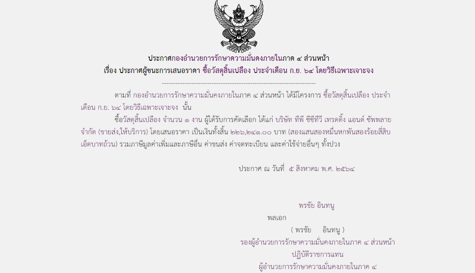 ประกาศผู้ชนะการเสนอราคา ซื้อวัสดุสิ้นเปลือง ประจำเดือน ก.ย. ๖๔ โดยวิธีเฉพาะเจาะจง (๒๒๖,๒๔๑.๐๐ บาท)