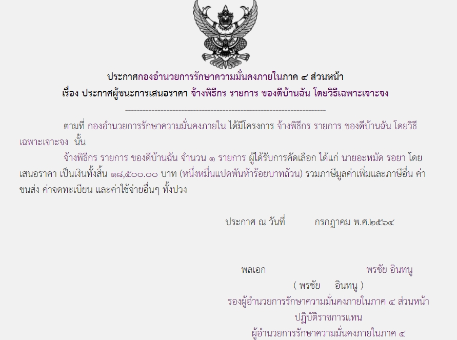 ประกาศผู้ชนะการเสนอราคา จ้างพิธีกร รายการ ของดีบ้านฉัน โดยวิธีเฉพาะเจาะจง( ๑๘,๕๐๐.๐๐ บาท)