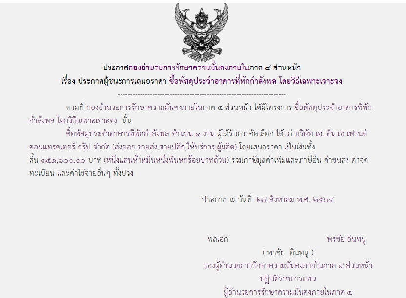 ประกาศผู้ชนะการเสนอราคา ซื้อพัสดุประจำอาคารที่พักกำลังพล โดยวิธีเฉพาะเจาะจง( ๑๕๑,๖๐๐.๐๐ บาท )