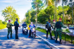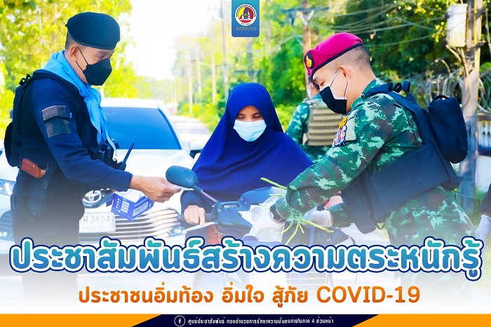 ที่บริเวณหน้าวัดเจาะไอร้องธรรมมาราม บ้านเจาะไอร้อง หมู่ที่1 ตำบลจวบ อำเภอเจาะไอร้อง จังหวัดนราธิวาส หน่วยเฉพาะกิจกรมทหารพรานที่ 48 โดยกองร้อยทหารพรานที่ 4816 ร่วมกับ ชุดสันติสุขที่ 403 หน่วยเฉพาะกิจสันติสุข จัดกิจกรรมประชาสัมพันธ์ ตระหนักรู้สู้ภัยโควิด-19 เพื่อประชาสัมพันธ์ให้ประชาชนในพื้นที่ที่ใช้เส้นทางสัญจรไป-มาได้ตระหนักรู้วิธีในการป้องกันตนเองจากการแพร่ระบาดของเชื้อไวรัสโควิด-19 ได้อย่างถูกวิธี พร้อมทั้งขอความร่วมมือให้กับประชาชนร่วมกันปฏิบัติตามมาตรการป้องกันการแพร่ระบาดของเชื้อไวรัส COVID-19 โดยการปฏิบัติตามหลัก D-M-H-T-T ของกรมควบคุมโรค กระทรวงสาธารณสุขอย่างเคร่งครัด ไม่ว่าจะเป็นการสวมหน้ากากอนามัยออกจากเคหะสถาน การล้างมือบ่อยๆ ด้วยน้ำสบู่หรือเจลแอลกอฮอล์ การเว้นระยะห่างเมื่ออยู่ในที่สาธารณะหรือที่ชุมชน เพื่อเป็นการระวังและป้องกันการแพร่กระจายของเชื้อไวรัส COVID-19 พร้อมทั้งยังได้ประชาสัมพันธ์และเชิญชวนประชาชนในพื้นที่ร่วมกันฉีดวัคซีน เพื่อเป็นการเสริมสร้างภูมิคุ้มกันหมู่ที่ดี