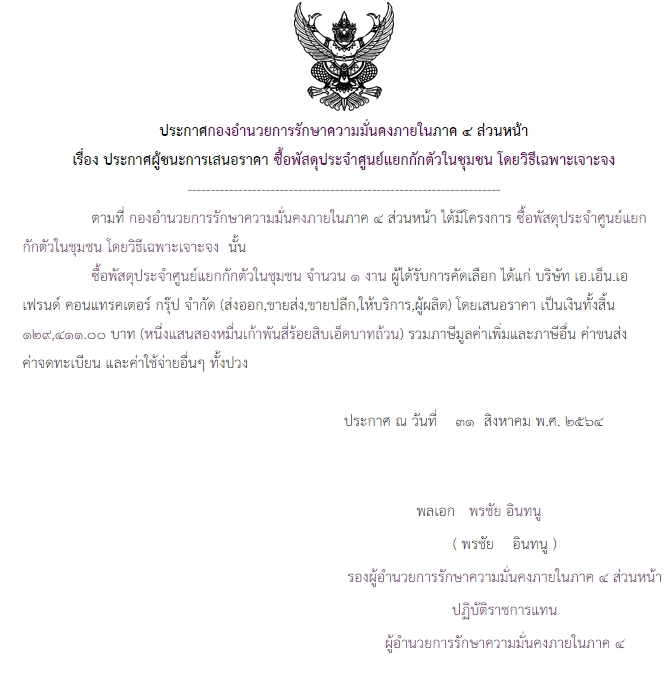 ประกาศผู้ชนะการเสนอราคา ซื้อพัสดุประจำศูนย์แยกกักตัวในชุมชน โดยวิธีเฉพาะเจาะจง(๑๒๙,๔๑๑.๐๐ บาท)