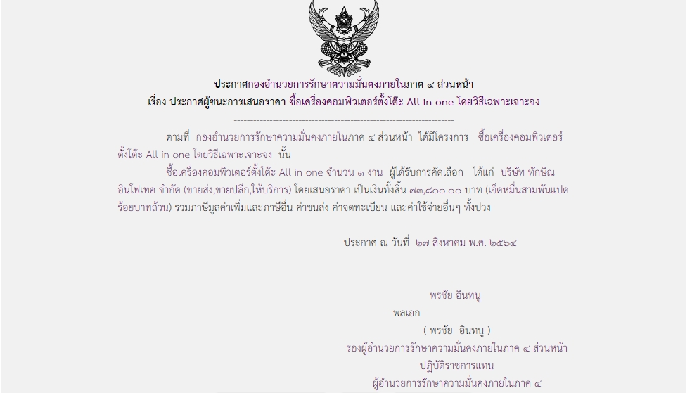 ประกาศผู้ชนะการเสนอราคา ซื้อเครื่องคอมพิวเตอร์ตั้งโต๊ะ All in one โดยวิธีเฉพาะเจาะจง(๗๓,๘๐๐.๐๐ บาท)