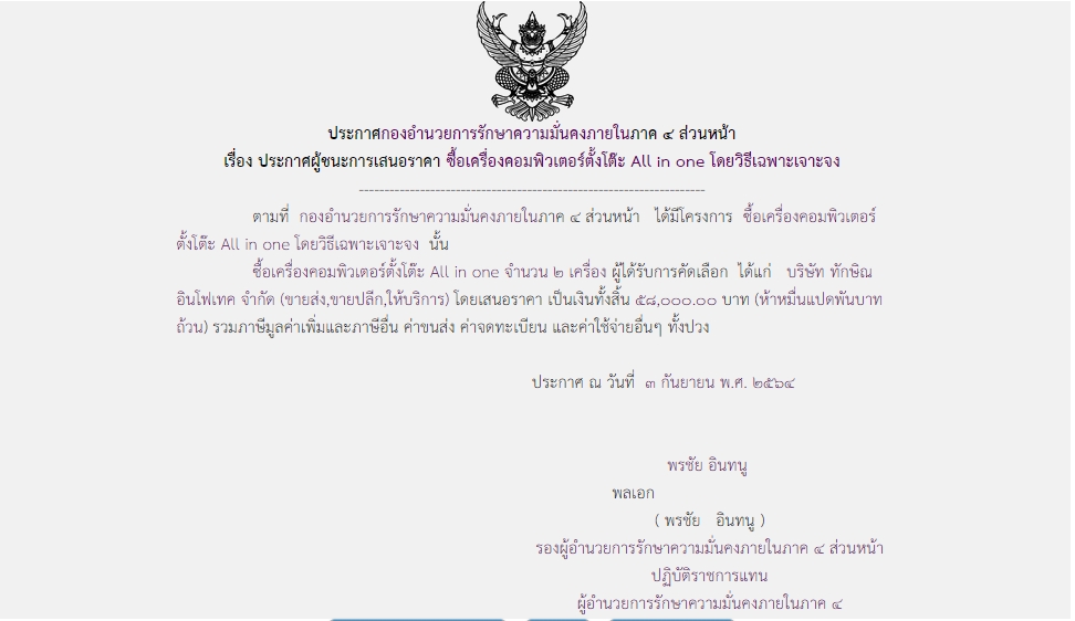 ประกาศผู้ชนะการเสนอราคา ซื้อเครื่องคอมพิวเตอร์ตั้งโต๊ะ All in one โดยวิธีเฉพาะเจาะจง (๕๘,๐๐๐.๐๐ บาท)