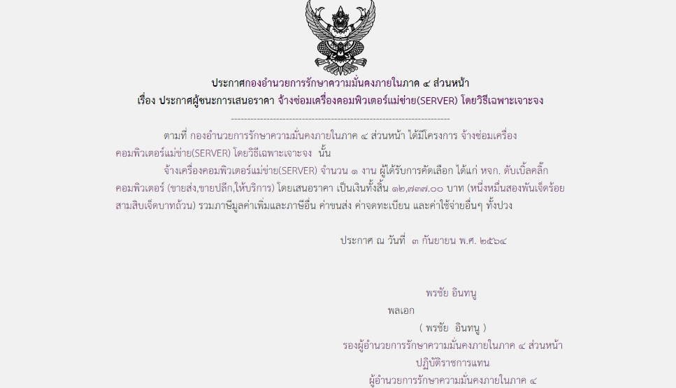 ประกาศผู้ชนะการเสนอราคา จ้างซ่อมเครื่องคอมพิวเตอร์แม่ข่าย(SERVER) โดยวิธีเฉพาะเจาะจง(๑๒,๗๓๗.๐๐ บาท)