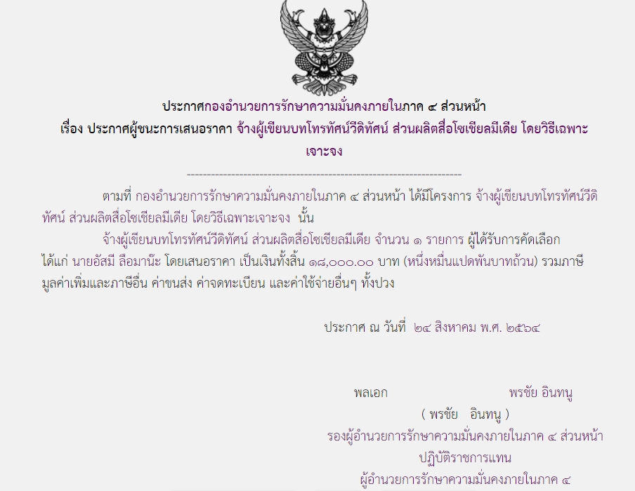 ประกาศผู้ชนะการเสนอราคา จ้างผู้เขียนบทโทรทัศน์วีดิทัศน์ ส่วนผลิตสื่อโซเชียลมีเดีย โดยวิธีเฉพาะเจาะจง(๑๘,๐๐๐.๐๐ บาท)