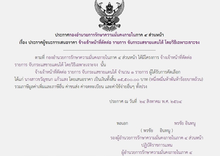 ประกาศผู้ชนะการเสนอราคา จ้างเจ้าหน้าที่ตัดต่อ รายการ จับกระแสชายแดนใต้ โดยวิธีเฉพาะเจาะจง (15,500.00 บาท(1))
