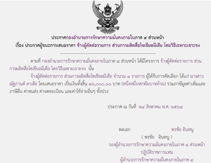 ประกาศผู้ชนะการเสนอราคา จ้างผู้ตัดต่อรายการ ส่วนการผลิตสื่อโซเชียลมีเดีย โดยวิธีเฉพาะเจาะจง (16,000.00 บาท)