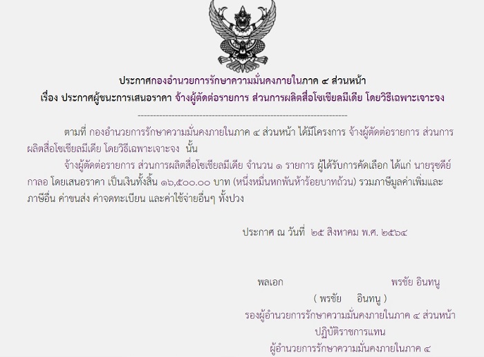 ประกาศผู้ชนะการเสนอราคา จ้างผู้ตัดต่อรายการ ส่วนการผลิตสื่อโซเชียลมีเดีย โดยวิธีเฉพาะเจาะจง (16,500.00 บาท)