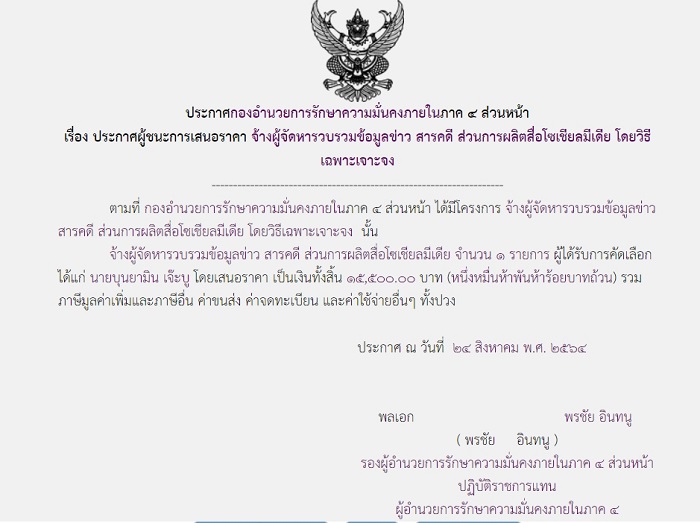 ประกาศผู้ชนะการเสนอราคา จ้างผู้จัดหารวบรวมข้อมูลข่าว สารคดี ส่วนการผลิตสื่อโซเชียลมีเดีย โดยวิธีเฉพาะเจาะจง (15,500.00 บาท)