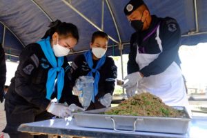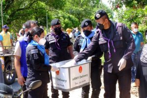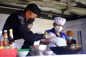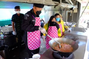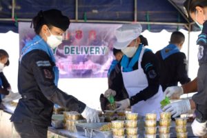 จากนั้น ผู้บังคับหน่วยเฉพาะกิจกรมทหารพรานที่ 44 ยังได้ร่วมกันประกอบอาหาร จัดทำข้าวกล่องพร้อมน้ำดื่ม จำนวน 300 ชุด ใส่ขบวนรถบริการ Army Delivery แจกจ่ายถึงมือให้แก่ประชาชนที่ได้รับผลกระทบจากสถานการณ์การแพร่ระบาดของเชื้อไวรัสโควิด-19 และประชาชนที่กำลังรักษาตัวอยู่ในโรงพยาบาลสนาม อำเภอกะพ้อ จังหวัดปัตตานี เพื่อเป็นขวัญกำลังใจแก่บุคลากรทางการแพทย์และประชาชนในพื้นที่ให้ร่วมกันต่อสู้กับวิกฤตโควิด-19 ครั้งนี้ไปด้วยกัน โดยมี นายจอน สุกป่าน ปลัดอำเภอ หัวหน้ากลุ่มงานบริหารงานปกครอง กำนัน ผู้ใหญ่บ้าน และชุดปฏิบัติการกิจการพลเรือนหญิงหน่วยเฉพาะกิจกรมทหารพรานที่ 44 ร่วมจัดทำอาหารอาหารกล่อง เป็นเมนูข้าวกะเพราไก่ ไข่ดาวและไข่เจียว ซึ่งอาหารกล่องเหล่านี้ ได้ถูกปรุงรสโดยแม่ครัวมุสลิม ถูกต้องตามหลักศาสนาอิสลาม จึงมั่นใจว่ามีฮาลาล และพี่น้องมุสลิมสามารถทานได้อย่างแน่นอน