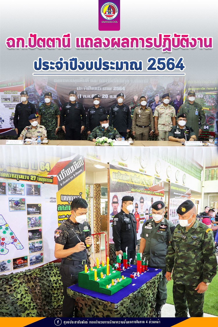 พลตรี คมกฤช รัตนฉายา ผู้บังคับหน่วยเฉพาะกิจปัตตานี กล่าวว่า ตลอดปีที่ผ่านมาหน่วยเฉพาะกิจปัตตานีได้ดำเนินการดูแลพื้นที่ตามนโยบายแม่ทัพภาคที่ 4 จนทำให้สถานการณ์ดีขึ้นอย่างเห็นได้ชัด ไม่ว่าจะเป็นการควบคุม พื้นที่ และการปฏิบัติการเชิงรุกต่อกลุ่มผู้ก่อเหตุรุนแรง นับว่าเป็นสัญญาณที่ดีที่จะทำให้สถานการณ์ในพื้นที่จังหวัดชายแดนภาคใต้ กลับคืนสู่สันติสุขในเร็ววัน นอกจากนั้นยังต้องขอขอบคุณ พี่น้องประชาชนชาวจังหวัดปัตตานีทุกท่าน รวมทั้งบุคลากรทางการแพทย์ ที่ช่วยกันในการควบคุมสถานการณ์การแพร่ระบาดของเชื้อไวรัส โควิด-19 ใน จังหวัดปัตตานี ให้ดีขึ้นตามลำดับ ทำให้ยอดการติดเชื้อและเสียชีวิตของประชาชน จังหวัดปัตตานีลดลงมาก ความร่วมมือจากพี่น้องประชาชนในการป้องกันการแพร่ระบาดของ เชื้อไวรัสโควิด-19 แบบที่พวกเรากำลังปฏิบัติกันอยู่แบบนี้ในห้วงต่อไป พวกเราจะชนะเชื้อโควิด-19 ไปด้วยกัน ในส่วนของสถานการณ์ในภาพรวมของจังหวัดปัตตานี ในงบประมาณนี้เหตุการณ์ความรุนแรงในพื้นที่ จังหวัดปัตตานี ได้ลดลงอย่างเห็นได้ชัด โดยมีสถิติการก่อเหตุความรุนแรง ทั้งสิ้น 27 เหตุการณ์ โดยอยู่ในห้วง ตุลาคม 2563 มีนาคม 2564 จำนวน 16 เหตุการณ์ และห้วง เมษายน – กันยายน 2564 จำนวน 11 เหตุการณ์ เปรียบเทียบในห้วง 6 เดือนแรกและ 6 เดือนหลัง ลดลง 5 เหตุการณ์ เหตุการณ์ลดลง 30 เปอร์เซ็นต์ ซึ่งเป็นผลมาจากการที่ เจ้าหน้าที่ทั้ง 3 ฝ่าย สามารถติดตามจับกุมบังคับใช้กฎหมายต่อกลุ่ม ผู้ก่อเหตุรุนแรงในพื้นที่ได้อย่างต่อเนื่อง ซึ่งในห้วงปีงบประมาณ 2564 มีสถิติการติดตามบังคับใช้กฎหมายสามารถวิสามัญกลุ่มผู้ก่อเหตุรุนแรงได้รวม 5 ครั้ง ผู้ก่อเหตุรุนแรงเสียชีวิตจำนวน 9 ราย รวม หมายจับ ป.วิอาญาทั้งสิ้น 34 หมายจับ ซึ่งผู้ก่อเหตุรุนแรงทั้ง 9 คน นี้ ล้วนแต่เป็นผู้ก่อเหตุรุนแรงที่สำคัญในพื้นที่จังหวัดปัตตานี เคยร่วมก่อเหตุที่สำคัญมาจำนวนมาก เช่น เหตุการณ์ปล้นร้านทองสุธาดา ในพื้นที่ อำเภอนาทวี จังหวัดสงขลา เมื่อวันที่ 24 สิงหาคม 2562 เหตุการณ์คนร้าย ลอบวางระเบิดแสวงเครื่อง ในพื้นที่ กทม. เมื่อวันที่ 2 สิงหาคม 2562 เหตุการณ์คนร้ายยิง อาสาสมัครชุดคุ้มครองตำบลประจัน ในโรงเรียนบ้านบูโกะ ในพื้นที่ อำเภอยะรัง ทำให้มีผู้เสียชีวิตจำนวน 6 ราย เมื่อ 10 มกราคม 2562 เหตุการณ์ คนร้ายลอบยิง ร้อยตำรวจโท วีระศักดิ์ สารพร เจ้าหน้าที่ตำรวจสถานีตำรวจภูธรโคกโพธิ์เสียชีวิต ในพื้นที่ อำเภอโคกโพธิ์ เมื่อ 7 ธันวาคม 2563 และอีกหลายเหตุการณ์สำคัญในพื้นที่ จังหวัดปัตตานี รวมทั้งในห้วงที่ผ่านมา มีการตรวจยึดยุท