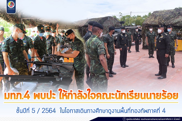 โดยแม่ทัพภาคที่ 4 ได้พบปะ พูดคุยให้กำลังใจนักเรียนนายร้อยชั้นปีที่ 5 ที่เดินทางมาศึกษาดูงานในครั้งนี้ กำชับนักเรียนทุกคน เก็บเกี่ยวประสบการณ์ ความรู้ เพื่อนำไปปรับใช้ให้เกิดประโยชน์อย่างสูงสุดในอนาคตต่อการปฏิบัติหน้าที่ต่อไป สำหรับการลงพื้นที่ศึกษาดูงานของนักเรียนนายร้อยชั้นปีที่ 5 มีกำหนดการระหว่างวันที่ 25 – 30 กันยายน 2564 โดยกองยุทธการ กองทัพภาคที่ 4 ได้บรรยายสรุปภารกิจ และการปฏิบัติงานของกองทัพภาคที่ 4 ด้วยระบบวีดีทัศน์ รวมถึงหน่วยที่เกี่ยวข้องภายในค่ายวชิราวุธ ประกอบด้วย มณฑลทหารบกที่ 41 กรมทหารราบที่ 15 และกรมทหารปืนใหญ่ที่ 5 พร้อมกันนี้คณะนักเรียนนายร้อย ชั้นปีที่ 5 ได้เยี่ยมชมการจัดแสดงอาวุธ และยุทโธปกรณ์ทางทหาร ของกรมทหารราบที่ 15 และกรมทหารปืนใหญ่ที่ 5 บริเวณด้านหน้ากองบัญชาการกองทัพภาคที่ 4 อีกด้วย