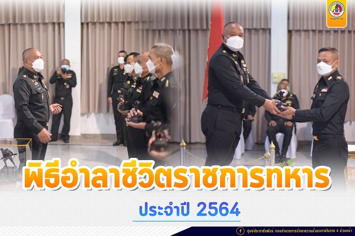 วันนี้ (27 กันยายน 2564) เวลา 09.30 น. ที่ สโมสรวีรไทย ค่ายวชิราวุธ อำเภอเมือง จังหวัดนครศรีธรรมราช พลโท เกรียงไกร ศรีรักษ์ แม่ทัพภาคที่ 4 เป็นประธานในพิธีอำลาชีวิตราชการทหาร ประจำปี 2564 ของกำลังพลซึ่งปฏิบัติหน้าที่ในหน่วยทหารภายในค่ายวชิราวุธ เพื่อให้ผู้ที่อำลาชีวิตราชการทหาร ครบกำหนดเกษียณอายุราชการได้มีความภูมิใจที่ได้เข้ามาเป็นส่วนหนึ่งของกองทัพบก เป็นการระลึกถึงคุณงามความดีของกำลังพล ซึ่งได้ปฏิบัติหน้าที่มาจนถึงวาระเกษียณอายุราชการ ด้วยความอดทน วิริยะ อุสาหะ และเสียสละ อันเป็นส่วนสำคัญที่ทำให้กองทัพบกมีการพัฒนา สมควรเป็นตัวอย่างที่ดีและเป็นที่ยกย่องเชิดชูสืบไป ทั้งนี้มีผู้เกษียณอายุราชการ จำนวน 56 นาย โดยมี คณะนายทหาร ข้าราชการ และส่วนที่เกี่ยวข้องเข้าร่วมในพิธี ภายใต้มาตรการป้องกันการแพร่ระบาดของเชื้อไวรัสโคโรนา 2019 (covid-19) อย่างเคร่งครัด