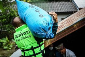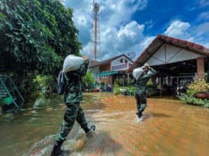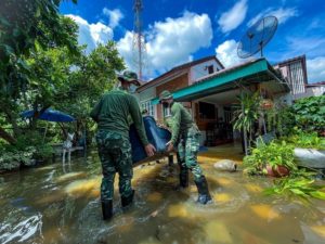 โฆษกกระทรวงกลาโหม กล่าวเพิ่มเติมว่า ตั้งแต่ 23 กันยายน 2564 ต่อเนื่องมาถึงปัจจุบัน กระทรวงกลาโหมโดยทุกเหล่าทัพ ที่มีที่ตั้งหน่วยทหารและความรับผิดชอบในพื้นที่ 27 จังหวัด ได้กระจายกำลังพลและยานพาหนะ เข้าไปช่วยเหลือเร่งด่วนในแต่ละพื้นที่ ตั้งแต่การแจ้งเตือนประชาชนในพื้นที่ การให้การช่วยเหลือเร่งด่วนพี่น้องประชาชนในการขนย้ายสิ่งของขึ้นที่สูง การเคลื่อนย้ายเด็ก คนชราและผู้ป่วยออกไปยังพื้นที่ปลอดภัย การจัดเรือท้องแบนและอากาศยานเข้าไปช่วยเหลือชีวิตผู้ที่ติดค้างในพื้นที่วิกฤต การจัดกำลังพลและชุดแพทย์เคลื่อนที่เข้าไปช่วยดูแลสุขภาพและแจกจ่ายถุงยังชีพผู้ประสบภัยที่ยังอยู่ในพื้นที่ การสนับสนุนรถครัวสนามประกอบอาหารแจกจ่ายผู้ประสบภัย