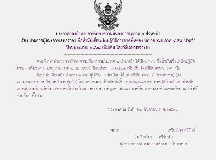 ประกาศผู้ชนะการเสนอราคา ซื้อน้ำมันเชื้อเพลิงปฏิบัติการภาคพื้นของ บก.กอ.รมน.ภาค ๔ สน. ประจำปีงบประมาร ๒๕๖๔ เพิ่มเติม โดยวิธีเฉพาะเจาะจง