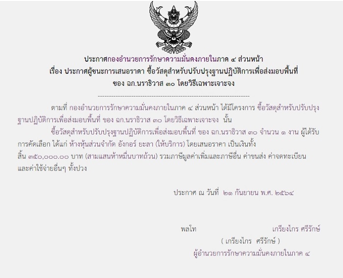 ประกาศผู้ชนะการเสนอราคา ซื้อวัสดุสำหรับปรับปรุงฐานปฎิบัติการเพื่อส่งมอบพื้นที่ของ ฉก.นราธิวาส ๓๐ โดยวิธีเฉพาะเจาะจง (๓๕๐,๐๐๐.๐๐ บาท)