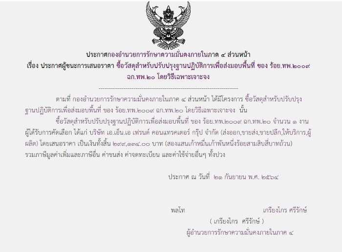 ประกาศผู้ชนะการเสนอราคา ซื้อวัสดุสำหรับปรับปรุงฐานปฎิบัติการเพื่อส่งมอบพื้นที่ ของ ร้อย.ทพ.๒๐๐๙ ฉก.ทพ.๒๐ โดยวิธีเฉพาะเจาะจง (๒๙๙,๑๓๔.๐๐ บาท)