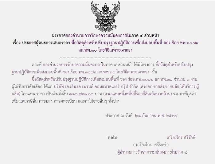 จัดซื้อ จัดจ้างประกาศผู้ชนะการเสนอราคา ประกาศผู้ชนะการเสนอราคา ซื้อวัสดุสำหรับปรับปรุงฐานปฎิบัติการเพื่อส่งมอบพื้นที่ ของ ร้อย.ทพ.๓๐๐๒ ฉก.ทพ.๓๐ โดยวิธีเฉพาะเจาะจง (๓๑๐,๔๒๑.๐๐ บาท) September 30, 2021 753 Share Facebook Twitter Google+ Telegram LINE สกบ.กอ.รมน.ภาค ๔ สน.