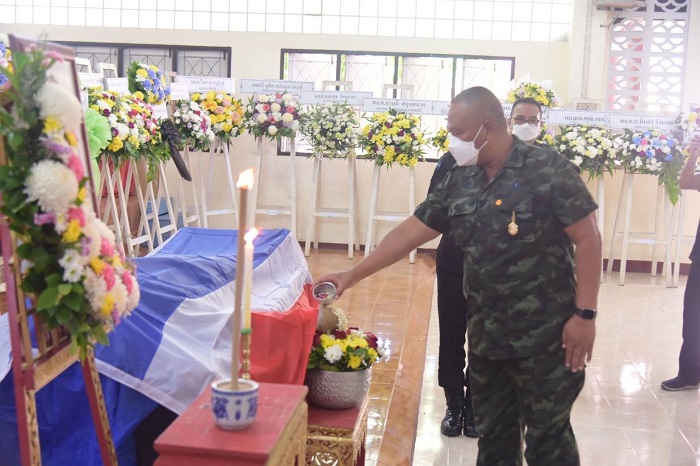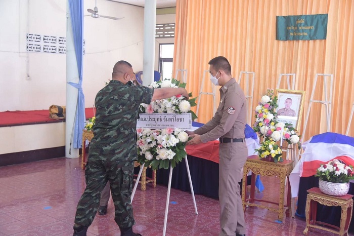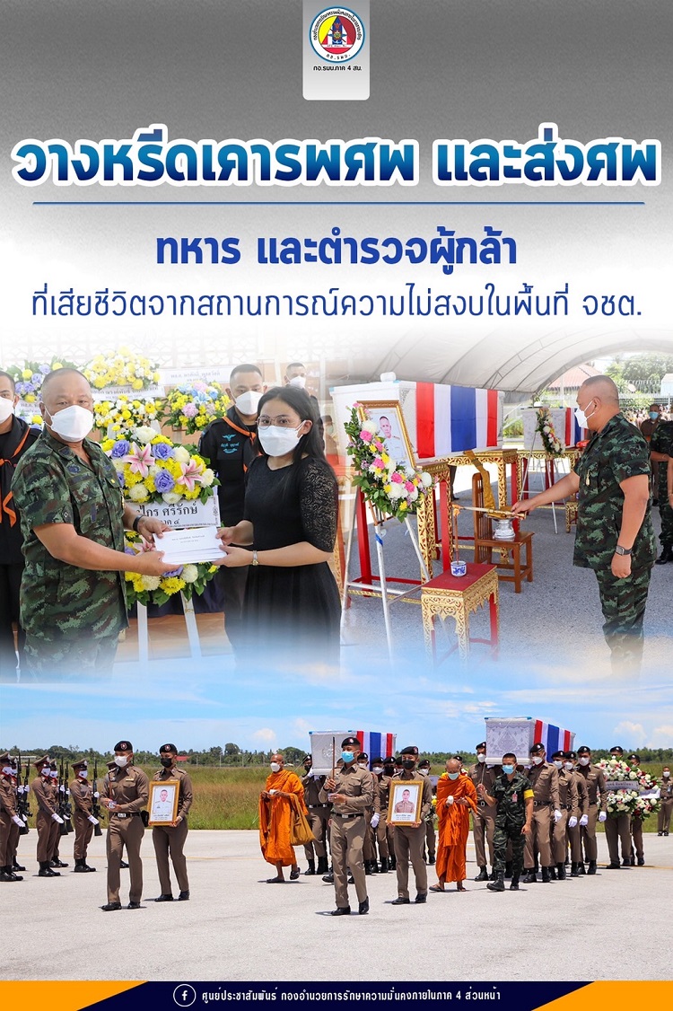 ทั้งนี้แม่ทัพภาคที่ 4 ได้เป็นประธานในพิธีวางหรีด และรดน้ำศพ 2 ตำรวจผู้กล้า และ ทหารกล้า อีก 1 นาย โดยเป็นผู้แทนวางหรีดเคารพศพเพื่อร่วมไว้อาลัย ของพลเอก ประยุทธ์ จันทร์โอชา นายกรัฐมนตรี ,พลเอก ณรงค์พันธ์ จิตต์แก้วแท้ ผู้บัญชาการทหารบก และ พลโท เกรียงไกร ศรีรักษ์ แม่ทัพภาคที่ 4/ ผู้อำนวยการรักษาความมั่นคงภายในภาค 4 ตามลำดับ หลังจากนั้นมอบเหรียญบางระจัน และใบประกาศเชิดชูเกียรติ ในการประกอบคุณงามความดีและความเสียสละ อันเชิดชูเกียรติแก่วงศ์ตระกูล พร้อมเงินช่วยเหลือจากหน่วยงานและส่วนราชการอื่น ๆ ให้กับครอบครัวผู้เสียชีวิต เพื่อเป็นการปลอบขวัญและให้กำลังใจแก่ครอบครัวและญาติที่ต้องสูญเสียบุคคลอันเป็นที่รัก จากนั้น ได้นำหัวหน้าส่วนราชการ ทหาร ตำรวจ และประชาชน ร่วมรดน้ำศพ เพื่อเป็นการไว้อาลัยกับการจากไปของวีรชนผู้กล้าทั้ง 3 นายในครั้งนี้