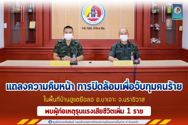 ทั้งนี้ กองอำนวยการรักษาความมั่นคงภายในภาค 4 ส่วนหน้า ขอชี้แจงให้ทราบโดยทั่วกันว่า ผู้ก่อเหตุรุนแรงที่เสียชีวิตจากการยิงต่อสู้กับเจ้าหน้าที่ตั้งแต่วันที่ 28 กันยายน 2564 จนถึงปัจจุบัน ยื นยันแล้วมีจำนวน 5 ราย โดยญาติได้รับศพไปประกอบพิธีทางศาสนาครบทุกรายแล้ว และหากมีความคืบหน้าจะแจ้งให้ทราบต่อไป