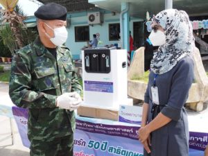 ที่ อำเภอยะหริ่ง และอำเภอสายบุรี จังหวัดปัตตานี พันเอก กฤศณัฏฐ์ จันทร รองผู้บังคับหน่วยเฉพาะปัตตานี ร่วมส่งมอบเครื่องผลิตออกซิเจน ขนาด 10 ลิตร จำนวน 2 เครื่อง ให้กับ โรงพยาบาลยะหริ่ง อำเภอยะหริ่ง และโรงพยาบาลสายบุรี อำเภอสายบุรี จังหวัดปัตตานี แห่งละ 1 เครื่อง ร่วมกับ รองผู้บังคับหน่วยเฉพาะกิจกรมทหารพรานที่ 44 และหัวหน้าฝ่ายกิจการพลเรือน หน่วยเฉพาะกิจกรมทหารพรานที่ 42 ในการส่งมอบครั้งนี้ผ่านผู้อำนวยการโรงพยาบาล เพื่อร่วมเป็นจิตอาสาแบ่งปันในการช่วยเหลือพี่น้องประชาชนในพื้นที่จังหวัดชายแดนภาคใต้ ช่วงสถานการณ์การแพร่ระบาดของโรคติดเชื้อไวรัสโคโรนา 2019 (Covid-19)