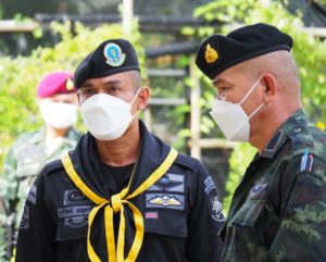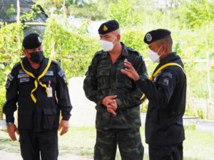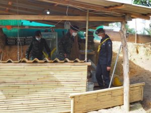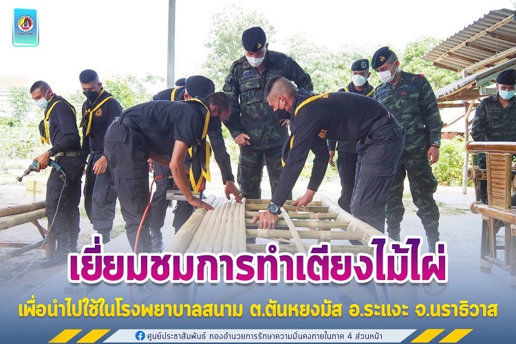 ที่ ตำบลตันหยงมัส อำเภอระแงะ จังหวัดนราธิวาส พันเอก ทวีรัตน์ เบญจาทิกุล ผู้บังคับหน่วยเฉพาะกิจกรมทหารพรานที่ 45 ให้การต้อนรับ พันเอก ก่อเกียรติ เข็มแดง รองผู้บังคับหน่วยเฉพาะกิจนราธิวาส และคณะ ลงพื้นที่ให้กำลังใจ และเยี่ยมชมการทำเตียงไม้ไผ่ เพื่อใช้ทำเป็นเตียงสนามสนับสนุนให้กับ โรงพยาบาลสนามที่ไม่เพียงพอต่อความต้องการรองรับผู้ป่วย