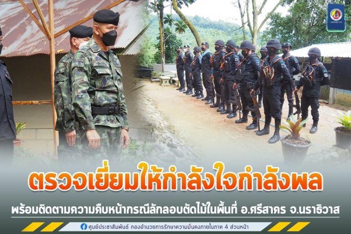 โดย พลตรีเฉลิมพร ขำเขียว ผู้บังคับหน่วยเฉพาะกิจนราธิวาส กล่าวว่า การลักลอบตัดไม้ทำลายป่า เป็นการกระทำที่ผิดกฎหมาย เป็นการทำลายทรัพยากรธรรมชาติ วันนี้จึงได้มาเยี่ยม ติดตามและให้กำลังใจเจ้าหน้าที่ทุกฝ่าย โดยเรื่องของทรัพยากรธรรมชาติ ถือเป็นภารกิจสำคัญ ซึ่งหน่วยเฉพาะกิจนราธิวาส เป็นหน่วยขึ้นตรงของกองอำนวยการรักษาความมั่นคงภายในภาค 4 ส่วนหน้า ได้รับมอบหมาย จากกองทัพบก ให้ดูแลทรัพยากรธรรมชาติและสิ่งแวดล้อม ปัจจุบันหน่วยงานทุกภาคส่วนพร้อมทั้งผู้นำท้องที่ ผู้นำท้องถิ่น พี่น้องประชาชน เห็นด้วยร่วมกันว่าทรัพยากรป่าไม้ควรค่าแก่การดูแล เพื่อปกปักรักษาไว้ให้กับลูกหลาน อีกทั้ง เป็นการรักษาทรัพยากรต้นน้ำอีกด้วย หากป่าไม้ถูกทำลายจะทำให้เกิดวิกฤติอื่นๆ ตามมา เช่น น้ำท่วม ส่งผลกระทบต่อสภาวะแวดล้อมและประชาชนในพื้นที่ จึงได้ลงพื้นที่มาติดตามความคืบหน้ากรณีดังกล่าว เพื่อหาแนวทางการแก้ไขปัญหาการลักลอบตัดไม้ในพื้นที่ป่า โดยส่วนใหญ่ ไม้ที่ถูกลักลอบตัดจะมาจากเขตป่าต้นน้ำที่มีความอุดมสมบูรณ์ ในพื้นที่สามจังหวัดชายแดนภาคใต้ พบสถิติการบุกรุก ตัดไม้ทำลายป่า ตั้งแต่ปีพุทธศักราช 2563-2564 ในอำเภอศรีสาคร อำเภอจะแนะ และอำเภอสุคิริน ของจังหวัดนราธิวาส จำนวนถึง 95 ครั้ง ด้วยกัน โดย พลโทเกรียงไกร ศรีรักษ์ แม่ทัพภาคที่ 4 /ผู้อำนวยการรักษาความมั่นคงภายในภาค 4 ได้กำชับให้มาตรวจสอบและมาให้กำลังใจเจ้าหน้าที่ทุกส่วนที่ทำงานร่วมกัน ขอให้ทุกคนมีความมุ่งมั่น ตั้งใจทำงานด้วยความระมัดระวัง เนื่องจากเป็นการขัดขวางผลประโยชน์ของผู้ที่เข้ามาลักลอบทำลายทรัพยากรป่าไม้ อาจจะมีการตอบโต้เจ้าหน้าที่ได้โดยขอให้กำลังใจทุกคนในการดำเนินการร่วมกันดูแลรักษาปกป้องทรัพยากรธรรมชาติของบ้านเรา ให้อยู่คู่กับลูกหลานต่อไป ในส่วนของผู้กระทำความผิดจะมีการตรวจสอบเพื่อดำเนินคดีตามกฎหมายต่อไป