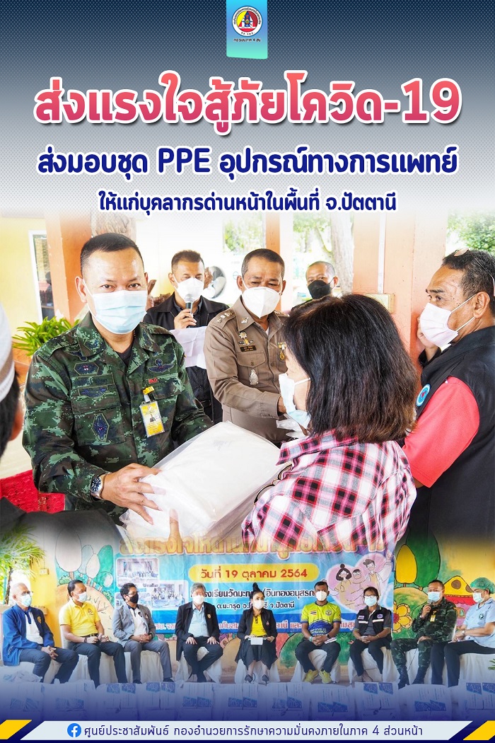 เมื่อวันที่ 19 ตุลาคม 2564 เวลา 09.00 น. ที่ โรงเรียนวัดมะกรูด (อินทองอนุสรณ์) ตำบลมะกรูด อำเภอโคกโพธิ์ จังหวัดปัตตานี พันเอก กฤศณัฏฐ์ จันทร รองผู้บังคับหน่วยเฉพาะกิจปัตตานี เป็นผู้แทน ผู้บังคับหน่วยเฉพาะกิจปัตตานี เข้าร่วมโครงการส่งแรงใจด่านหน้าสู้ภัยโควิด -19 การส่งมอบชุด PPE รวมถึงอุปกรณ์ทางการแพทย์ให้แก่บุคลากรด่านหน้าในพื้นที่ จังหวัดปัตตานี เพื่อเสริมสร้างขวัญและกำลังใจแก่บุคลากรทางการแพทย์ที่ปฏิบัติหน้าที่เป็นกำลังหลักในการดูแล รักษา ให้ความรู้ประชาชนในการดูแลป้องกันตนเองให้ปลอดภัยจากโรคติดเชื้อไวรัสโคโรนา 2019 (COVID – 19) โดยมี นาย อนุสาสน์ สุวรรณมงคล สมาชิกวุฒิสภา เป็นประธาน